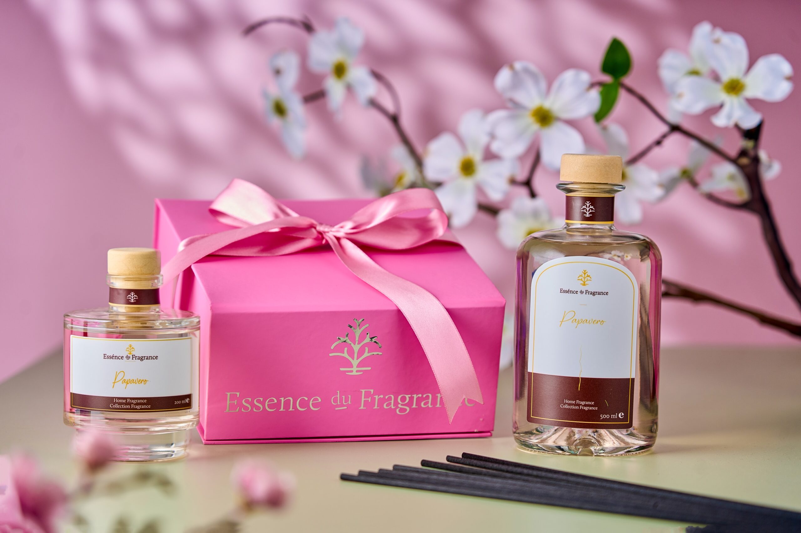Cutia cadou contine: doua odorizante de camera Papavero 200ml respectiv 500ml.